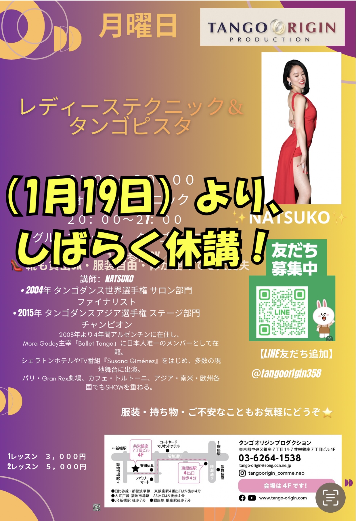 【月曜日クラス休講のお知らせ】第3月曜日(1月19日)より休講 再開のご案内は、追ってお知らせいたします。